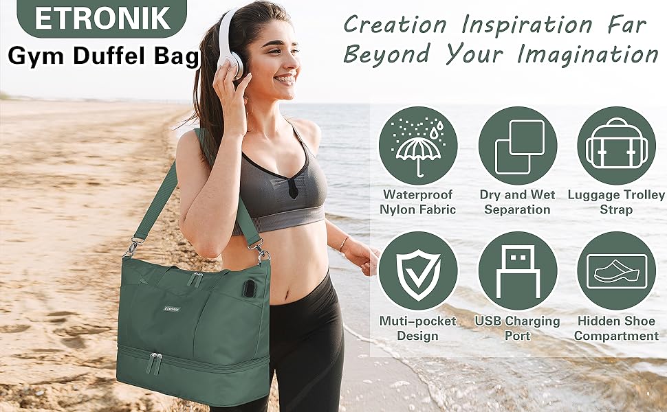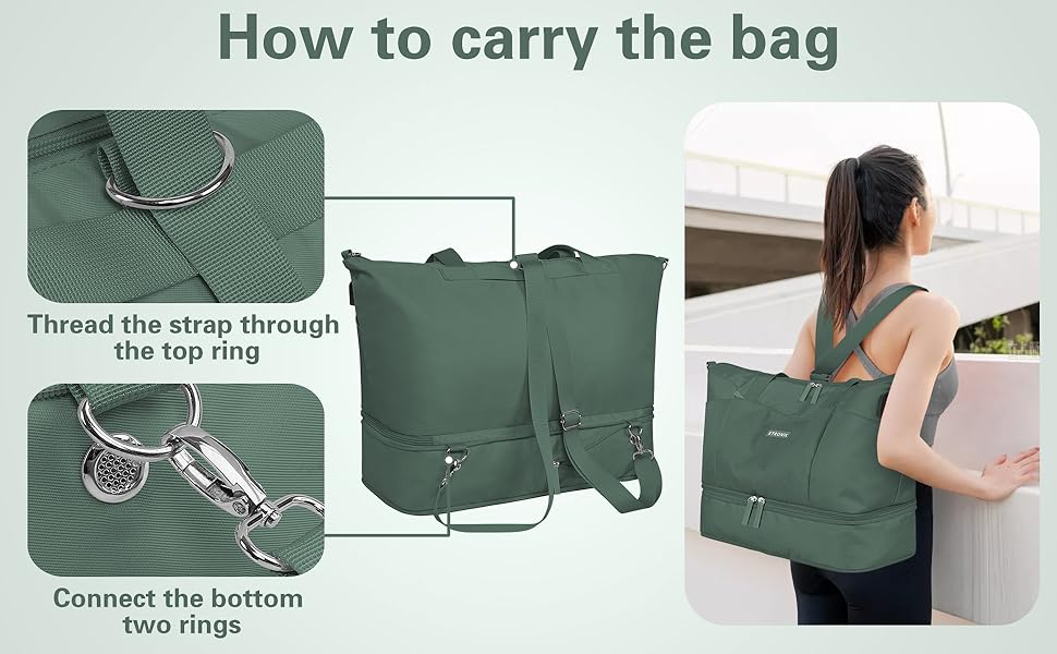 - 💙【Gym Bag with Wet Compartment】: A zippered waterproof PVC lined pocket for wet clothes or towels and a bathing suit. There are also 3 outside pockets for easy asses and a luggage strap for setting it on roll-away luggage. This gym duffel bag has enough room to keep all your stuff (clothing, makeup, hair styling tools, snacks, shoes, and more)